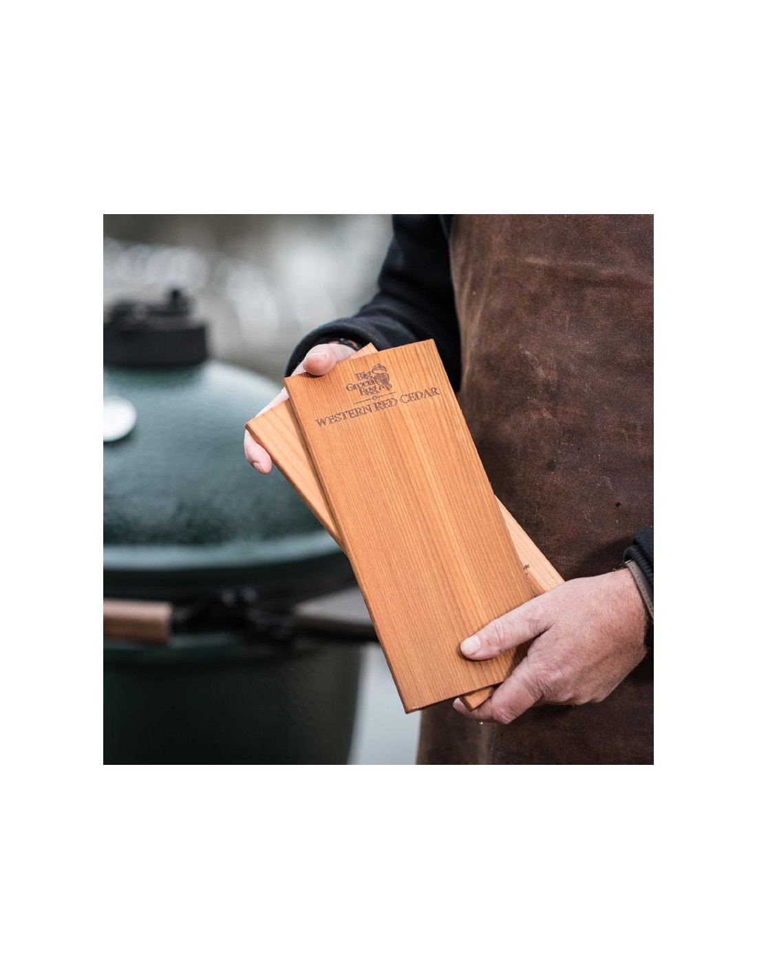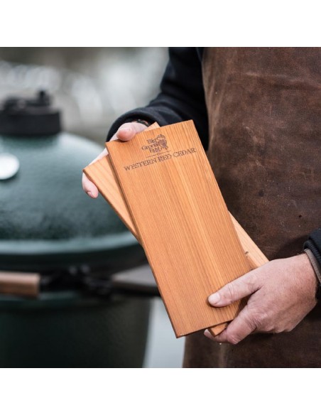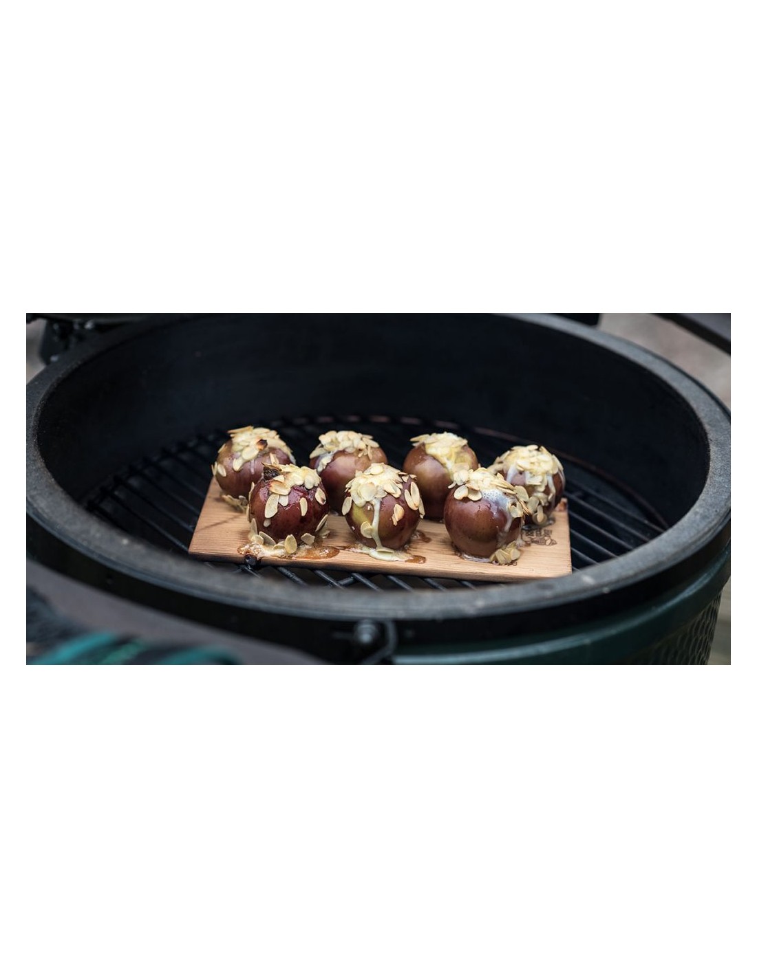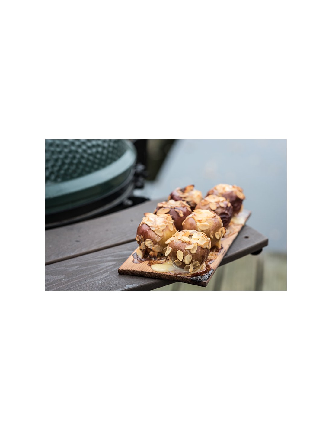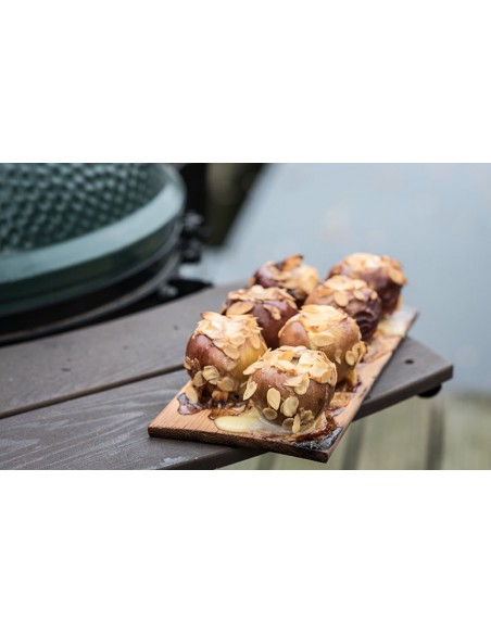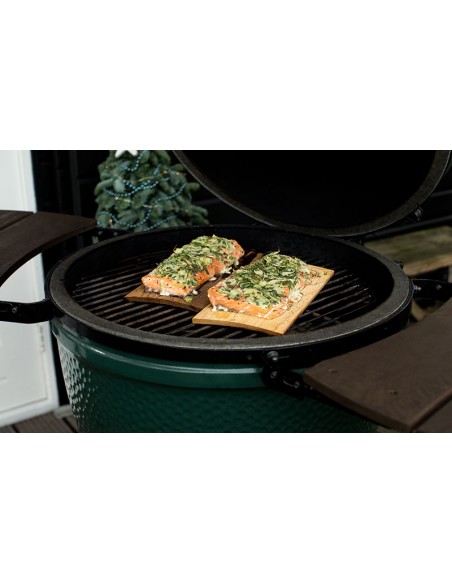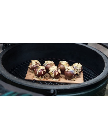 - Išdėliokite ingredientus ant (vandenyje išmirkytos) lentelės, o ją padėkite ant Big Green Egg kepsninės grotelių.