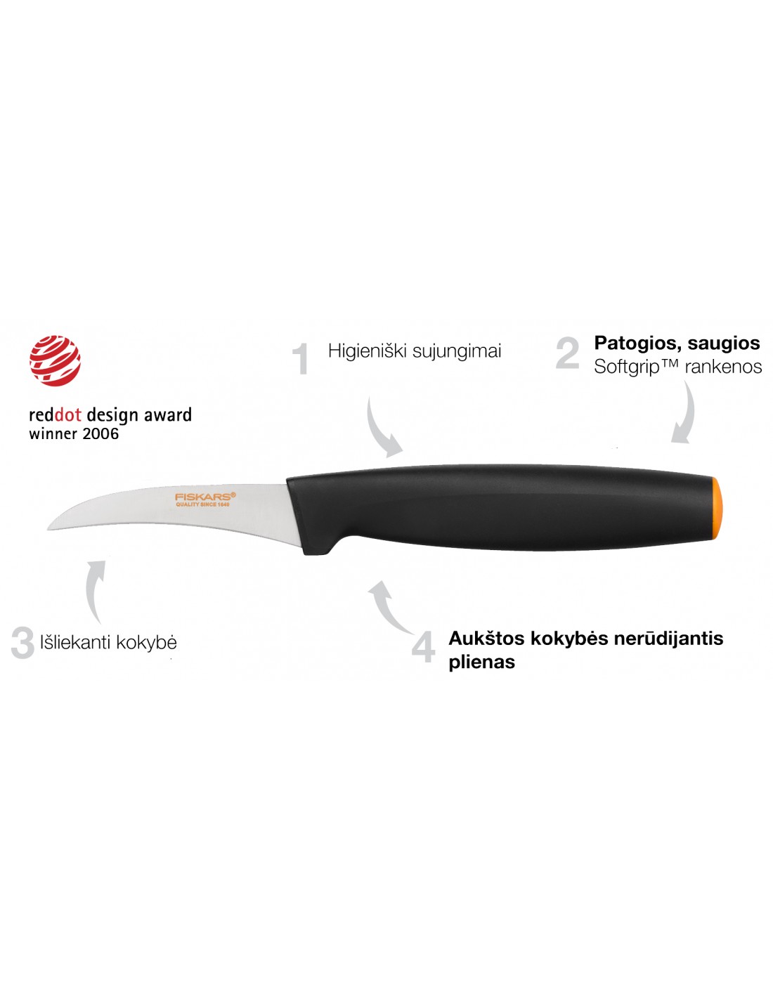 • Specialiai sukurta "FunctionalForm" peilio rankena leidžia dirbti patogiausioje pozoje ir atrodo šiuolaikiškai.