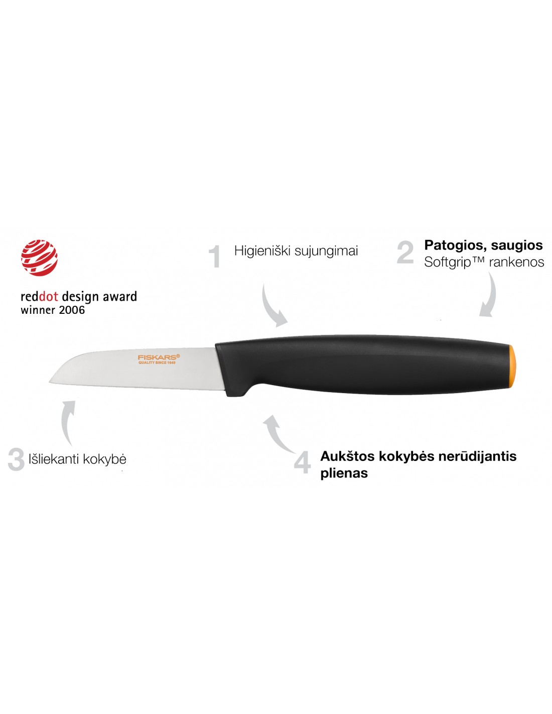 - Geležtė turi puikiai pjaunančius ašmenis, kuriuos nesunku išlaikyti aštrius naudojant Fiskars Roll-Sharp arba metalinį galąstuvą. "FunctionalForm" peiliai yra vieni populiariausių Fiskars gaminių.